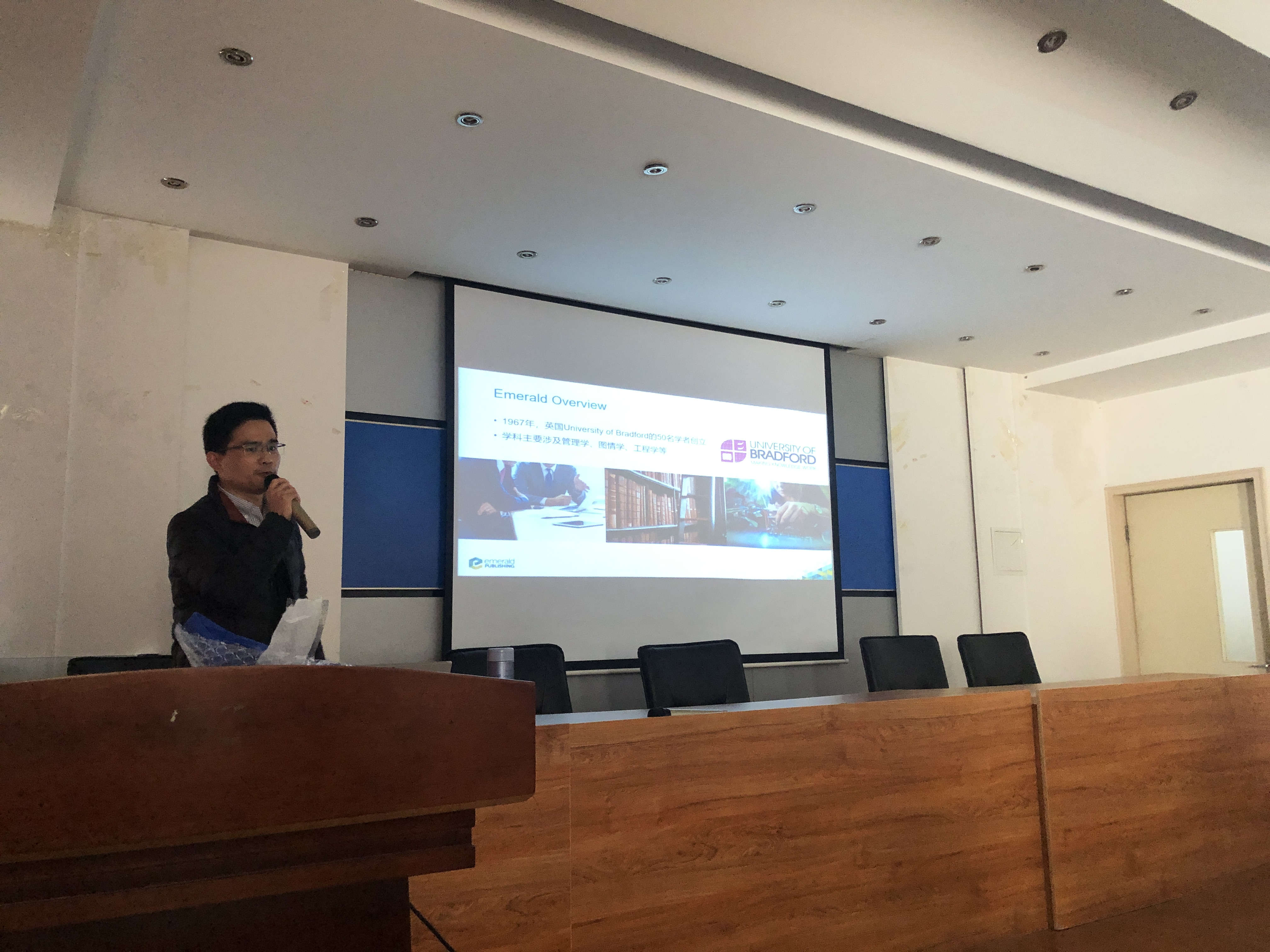 2019年11月21日下午在文科楼楼502成功举办了“Emerald资源使用与投稿交流”培训讲座。讲座由图书馆副馆长王傲镭主持,管理学院杜同爱副院长致辞介绍,Emerald出版社中国区销售总监饶先栋主讲。