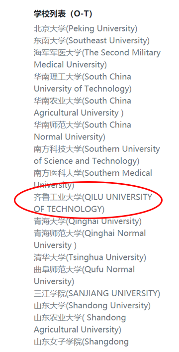 2、在列表中选择学校名称——学校列表(O-T)——齐鲁工业大学。