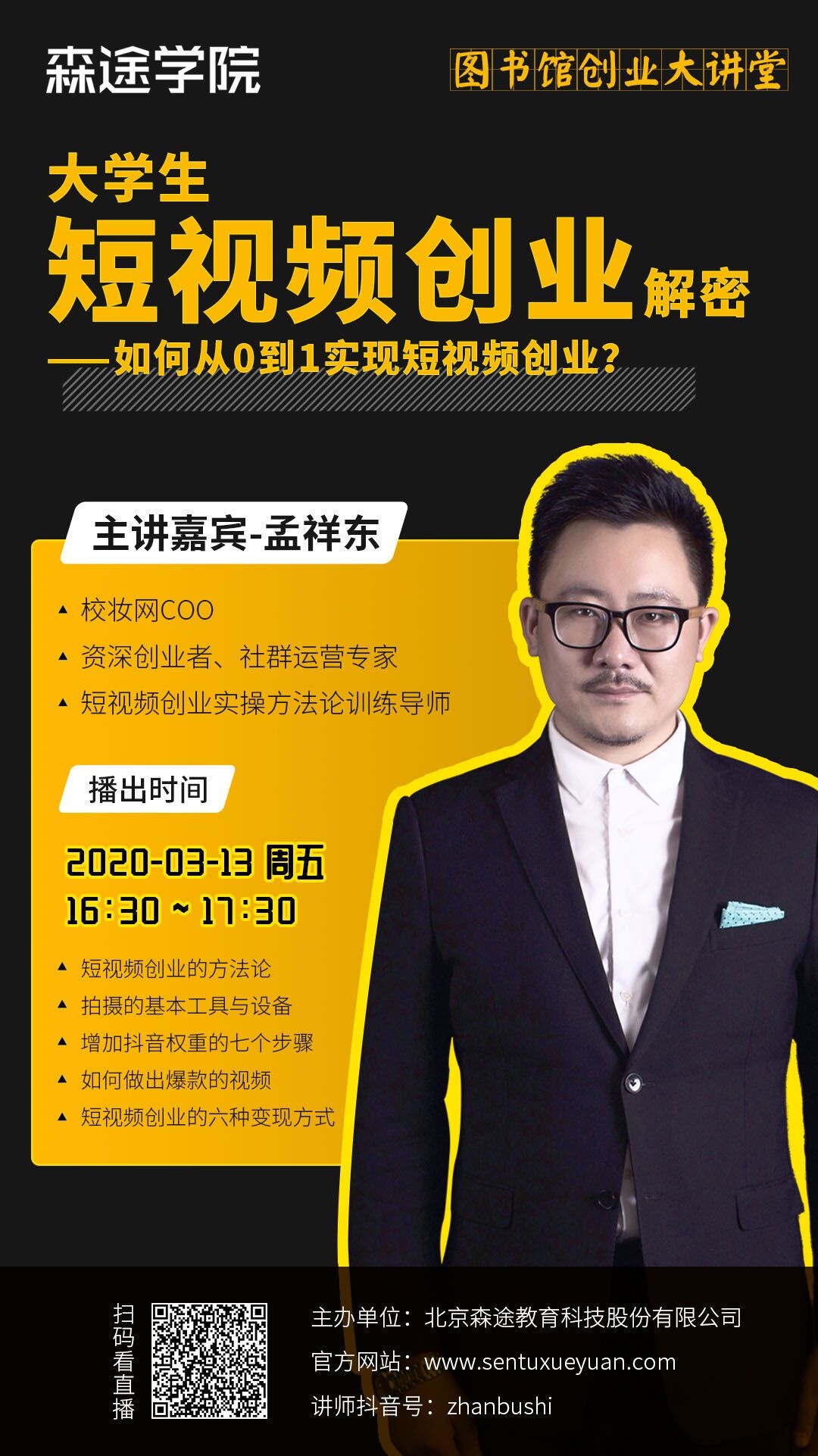 图书馆将与森途学院联合举办关于大学生短视频创业的线上专题讲座,本次直播我们邀请到了资深创业者及社群运营专家,将从多维度为大家进行详细讲解,只要你有想法,只要你对短视频感兴趣,就不要错过这次机会!