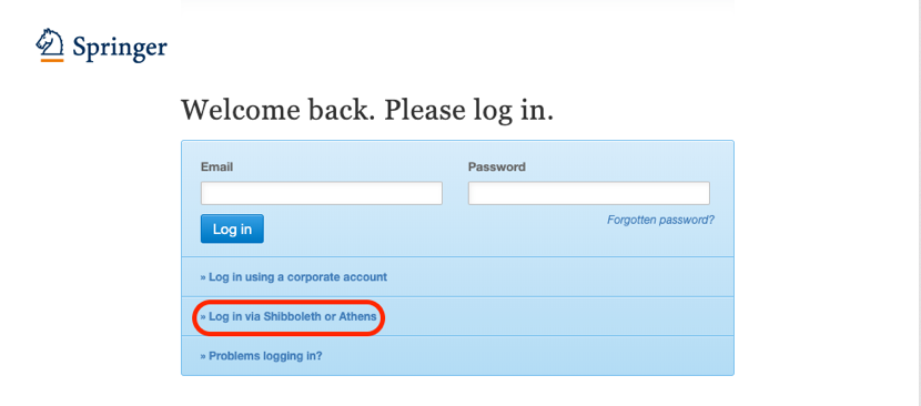 在登录页面中,选择“Log in via Shibboleth or Athens”