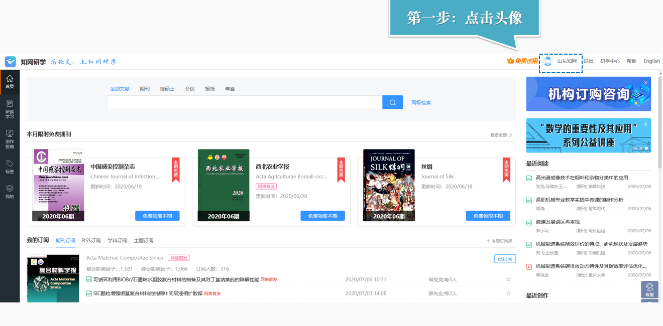 知网研学(x.cnki.net)是以搭建个人探究式学习环境为核心,以提高自主学习和创新能力为目标,利用XML碎片化、知识重组、知识网络构建等技术,打造以汇聚资源、理解知识、创作表达、个人知识管理为核心功能的终身学习平台。能够为全校师生提供免费在线阅读期刊、学位论文、会议论文和年鉴等学术资源,以及智能检索、整刊浏览、HTML阅读、笔记汇编、论文撰写、个人学术成果注册等功能。具体使用步骤如下: