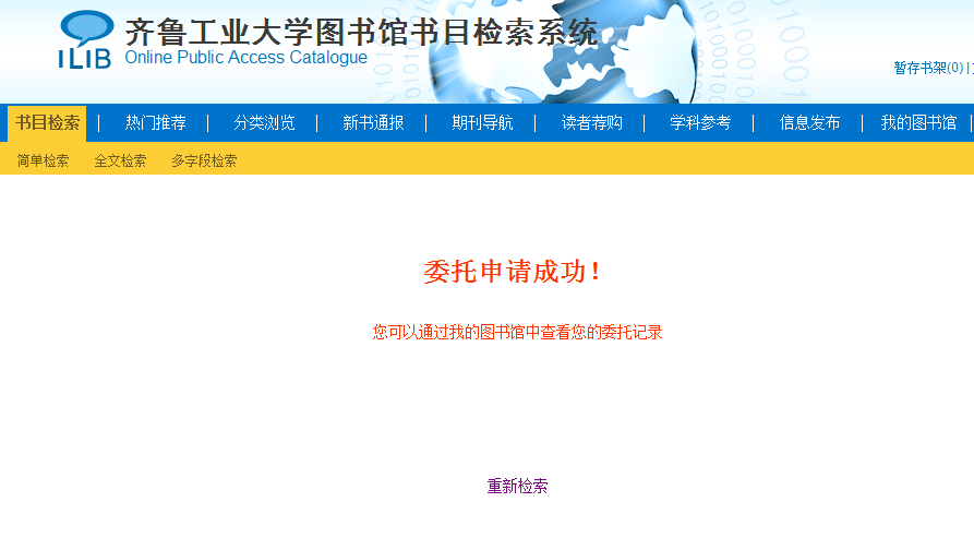 点击“书目检索”下方的“委托申请”,进入委托申请界面,进行委托(注意:必须填写个人电子邮箱及联系电话,否则无法收到取书通知,试运行期间,委托图书自通知取书日期保留5天,5天之内不来取书,视为放弃委托。委托申请服务只针对我校长清校区全体师生,委托时注意只可委托借阅长清校区图书馆图书。取书地址图书馆二楼大厅东侧)。