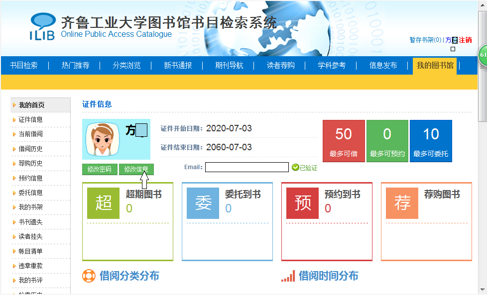 进入登录界面。(注:1.登录密码默认身份证后六位; 2.自行设置的密码 ,进入系统后可由读者重新设置; 3.请及时完善Email及手机号码信息,登陆后可以修改,请大家准确填写,以便收到图书馆发给您的预约图书信息。)