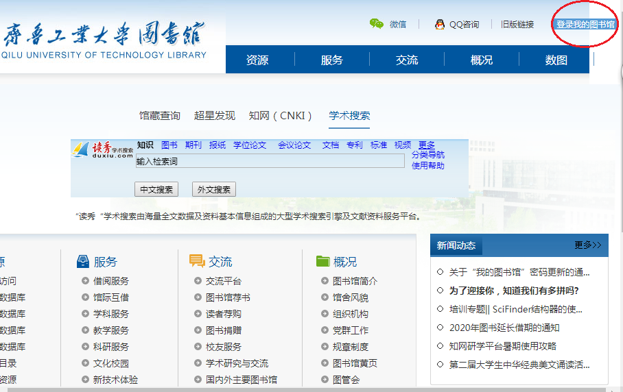 1.登录图书馆主页http://lib.qlu.edu.cn/,点击“我的图书馆”。