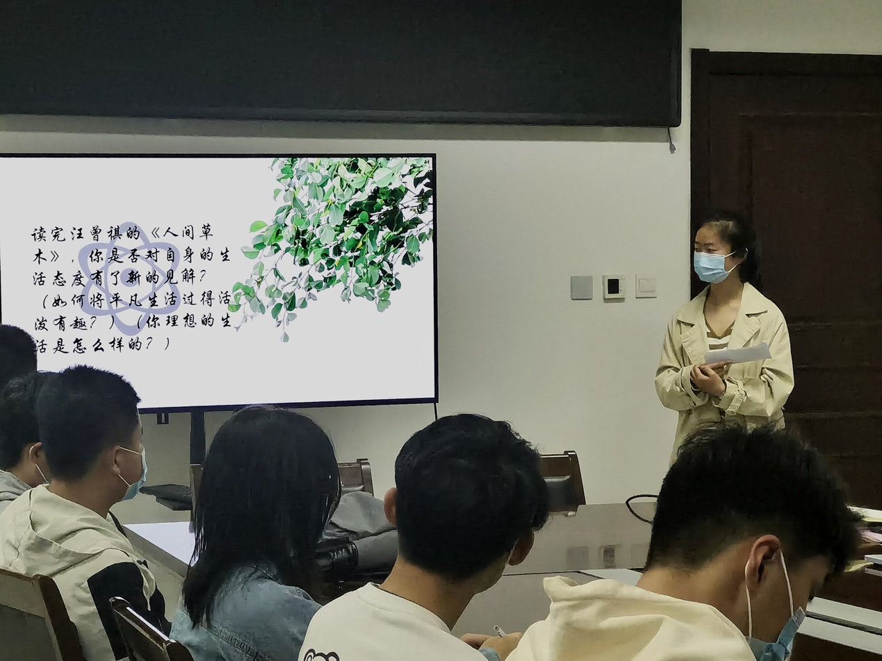 活动还在如火如荼地进行着,随后,主持人引出第二个问题:通过人间草木,你对汪老有什么新见解?宋佳音同学率先发言,先引用王国维《人间词话》介绍了“通感”这一艺术表达方式,随后提出王老在描写花草虫鱼的时候常常结合多感官描写,总是让人耳目一新,内心一颤,将其描绘的活灵活现,细腻真实。随后,付安琪同学与郑方鹏同学提出类似观点,付安琪同学由汪老另一作品《随遇而安》切入,从这篇文革回忆录中体会到汪老相信人心向善,对世间的不公不反抗不抱怨,懂得苦中作乐,郑方鹏同学引用苏东坡先生“吾心安处是吾乡”的诗句,认为汪老是具有禅意与文气的作家,执念不深却并非佛系,而是实现一种生活的超脱,对待文字与生活,想写即写,随心而动。最后,徐招财同学发表感悟,通过人间草木,他所看到的汪曾祺先生不仅仅是一位文学大家,更是一位生活美学家,懂得寻找自然之美,生活之美。