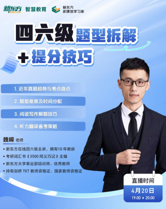 为助力广大考生高效备考大学英语四六级考试,新东方多媒体学习库特别推出“四六级题型拆解+提分技巧”线上直播。本次直播将深度剖析近年考情,系统梳理各大题型核心难点,并结合解题技巧与听力翻译备考策略,帮助考生理清备考思路,提升应试能力。